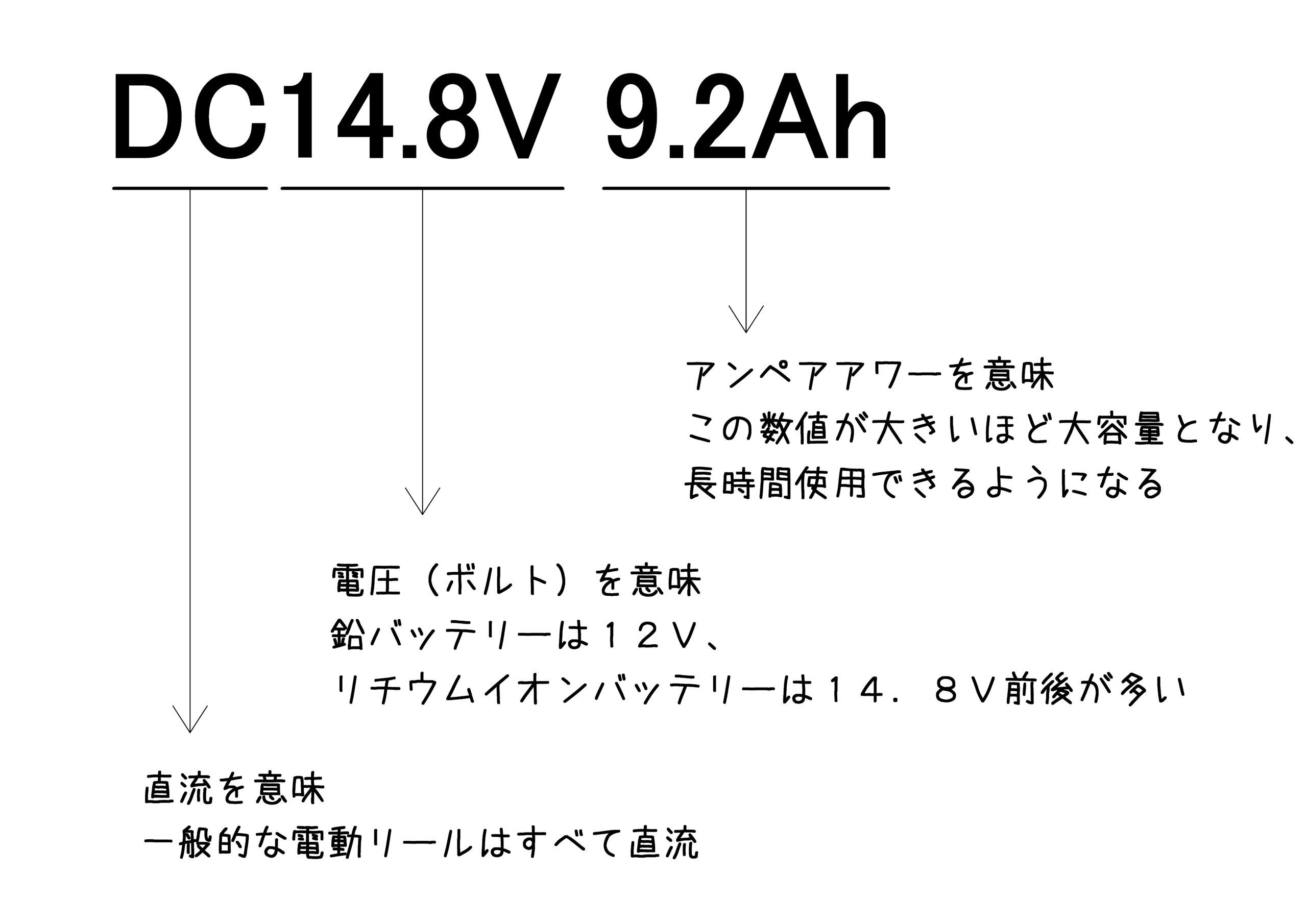電動リール用バッテリーを見てみると、DC14.8V 9.2Ahと言った数字が登場します。DCは直流の意味で、14.8Vは電圧、9.2Ahは電流と時間の積算値で9.2Aの放電を1時間行える・・・ と説明が難しくなってしまうので、釣りに必要な事だけ簡単に説明します。